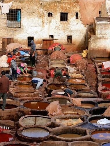 皮革制品是菲斯另一张璀璨的名片。位于市中心的传统染坊,犹如一块巨型的天然调色板,至今仍延续着千年不变的皮革鞣制工艺。这些染坊不仅是全城鞋匠、裁缝与手工艺人的原料殿堂,更成为最具视觉冲击力的旅游地标。